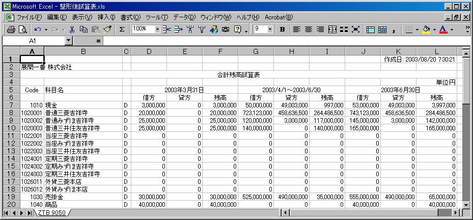 表計算ソフトウェアのマクロを利用すると、帳票ファイルの整形を自動化することができます 現在、表計算ソフトウェアのスタンダードになっているエクセルには、マクロの自動記録機能が搭載されています この機能を利用して、試算表ファイルの整形を自動化する例を以下に掲載します この例では、汎用性を持たせるために、法人名やタイトル名を入力できる仕様にしてあります 整形結果の一部も併せて掲載します、この結果はエクセルファイルとして保存できますから、各月の試算表として保存しておけば、試算表を基に作成する帳票の作成などにも利用できるでしょう |