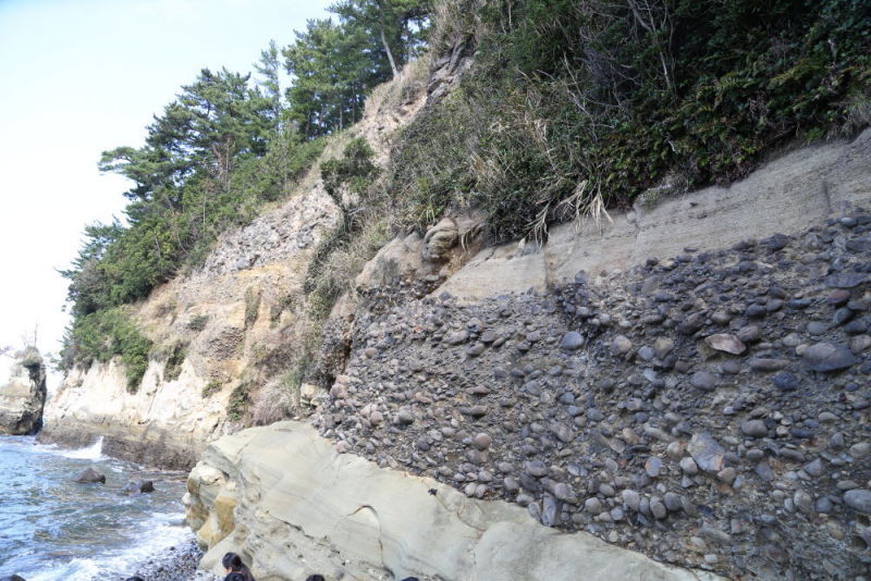 新生代第3紀中新世 約1200万年〜1300万年前に堆積した米ケ脇層(こめがわきそう)を観察しましょう。崖はいつも浸食をを受けているため常に新しい露頭ができます。堆積岩は火山岩に比べ、柔らかいため浸食されて、大きな入り江になっています。海食洞、離れ岩などの海食地形を観察しましょう。夫婦岩に注目しましょう。レキ、砂、泥の土石流堆積物など地層のつながりを観察できます。