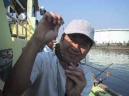 実は一昨年の初釣り(2002/01/13)も同じターゲットだったのだが、後半がタチウオで極端な食い渋りでオデコになった事を思い出しました。そう言えばタチウオは朝から午前に食いが立つことが多く、船がたくさん集結してしまうと反応が底近くに移動して食わなくなる事が多いのです。その事を思い出して前半タチウオ、後半エギングにしたのですが、これが大正解。竿入れからアタリがありトックンが餌を切っているのに、北けずねが1本目を上げトックンの悲鳴が船中に響き渡ります。右舷ではちかちゃん、大久保さん、まるかつのルアーチームが必死にジギングを繰り返しますがノーバイト。その時、底まで落としてしゃくりあげた大久保さんの竿に強烈な重量感が訪れました。あまりの強さ、重さに「サメじゃないの?」と本人は半信半疑でしたが水面近くまで来ると巨大タチウオの腹掛かりと分かり一同ビックリ!!。普通、タチウオはタモですくう事は無いのですが、あまりの大きさにランディングしました。(網が鋭い歯で破れちゃうからね)しかし、その後ルアーには反応が鈍く、3人とも分の良いエサ釣りに転向しました。するとやっとまるかつにも強烈なアタリ、浮かせてみると先ほどの大久保さんには及びませんが108cm、1.5kgの大物で指5本サイズでニンマリです。5本ほどオカズをキープしてからは超大物狙いで底中心に切り替えたり再度ルアーを試したりしましたが記録物をゲットすることはできませんでした。結局、良くつれたのは1時間程度でやはり反応が底に沈み、口を使わなくなってしまいました。皆、満足顔でオカズを確保しましたので二つ目のターゲットに切り替えることにしました。今までですと、エギングは剣崎間口港前の根回りでやるのですが、今日初めてやる人が結構いるので根掛かりが少なくポイント移動の短い竹岡沖から攻める事にしました。