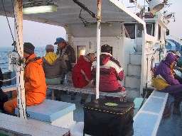 先月、葉山出船の根魚五目で良い思いをした事を(2005/02/18参照)親父に話したら、「漁の帰りでも場所を見て見るか。」とその気になったみたいでした。数日後、電話があり「葉山の船がやってる場所がわかったぞ。」と自信マンマンな口ぶりでした。 そこで「デカムツ挑戦ツアー」を企画したところ、いとうちゃん、とくさん、そしてとくさん行きつけの店あくねの親父さんが名乗りを上げたのでした。 後は天気次第でデカムツをゲットしたような気分になっていました。 沖ノ瀬のポイントに着いてみると、さほど潮が速そうな感じではないのですが、仕掛を下して見ると上潮が早く糸フケがかなり出ます。 |