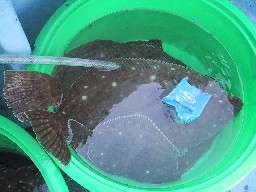 イシガレイ(14)34〜55cm、0.5〜2.1kg マコガレイ(1)23cm 最近ではうちの会社の釣り部のイサキ釣り大会にも道場破りしに来るようですし、いろいろなところに顔を出している様で、まさにネット釣師の面目躍如と言ったところでしょうか。来週のまるかつ主宰「デカムツ挑戦ツアー」にもエントリーしてくれていますし?? さて、ビックイシガレイリベンジは一人での釣行となりましたが、「平日なので空いているだろう。」とタカを括って出船1時間前に鹿島港に着き、トモ2番を確保したのですが、その後来るわ来るはでアッと言う間に大型船は一杯、2隻出しと相成りました。 右隣にはベテランのおじさん(ちょっと年上、会社の偉いさん風)、左隣は「鹿島のカレイは始めてです。」という欲のなさそうなおじいちゃんというご近所付き合いとなりました。 40分位でポイントに着き、2本竿に青イソメとホッキガイを付けて投入しました。 30分後に右隣りに35cm級が来てから、後ろにも魚が回ってきました。続いてまるかつの手持ち竿にも待望のククッ、ククッというカレイ独特のアタリが到来しました。一呼吸待って聞き上げると結構な抵抗をして底を離れるのを嫌がります。 |