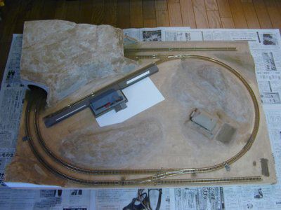 その後、線路にはバラストをまいて固着。バラストはボンド水(木工ボンド+水)を薄くしすぎ、固着後バラバラと崩れてやり直すハメになり難儀しました。やはり、バラスト用に薄めるのは2倍程度が基本です。バラストはTomixのものはNにはやや大きいとのことで、KATO(ウッドランドシーニックス)の中目のものを使いました。でも、まだ大きいようです。作業性は、大きめのほうが良いので、私にはちょうどよかったかも知れません。バラストの固着についてはTipsのコーナでも少し書いています。