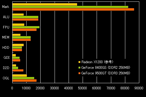 Radeon X1200は入手当初の「Aspire M1100」のスコアです。一発取りの数値なので参考程度(FPUの差が謎)ですが、にしてもエクスペリエンスインデックスが過大評価してるのか、CrystalMarkがシビアなのか(笑)。とりあえず、最新のドライバもあてられますし、GPU温度も8400GSが60℃になる様な場面でも45〜6℃で安定しているので、9500GTに交換した甲斐があったかなと。何より、旗艦から戯画売人製品を排除できたのが嬉しいです(核爆)。