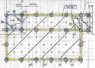 ||| 基礎平面図 ||| 家の構造壁に沿って基礎が設けられています。 図中、1間毎に描かれている丸印は地盤改良の杭の位置を表しています。 |