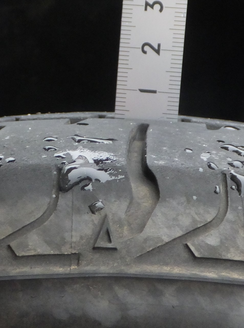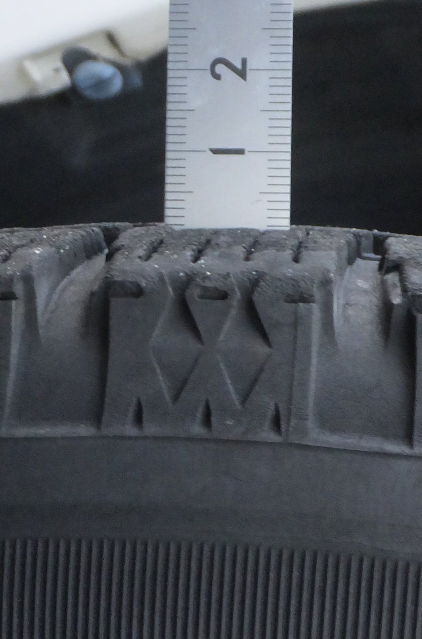 履き替え前(雑記の記憶 May.2025 の「え・と・せ・と・ら」の「タイヤ交換(冬→夏)」を参照)が大体 4.0mm だったので、左前が 1.0mm、右後ろが 0.5mm くらい減った感じでしょうか。