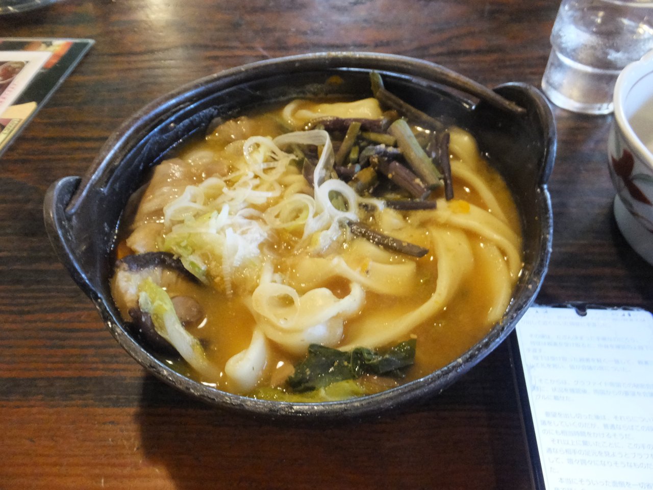 ほうとうは、「かぼちゃのほうとうをベースにしています」と店員さんの説明があったように、きのこや山菜が入った上で、大きな皮付きのかぼちゃが下に入っていました。