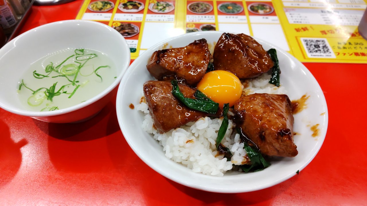 [レバ玉丼(左)とレバニラ(小)]