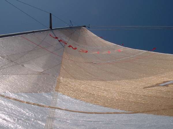 約10ノットの風のクロス時のメインセール。カーブは言うことなし。但し、メインのパワーが大きくなったせいか、以前より若干ヘルムがきつく感じる。アフトレーキの度合いを少し変更する必要ありか。