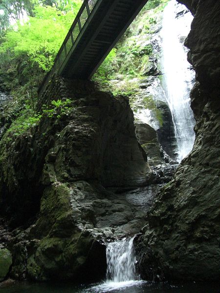 蜻蛉の滝 (奈良県吉野郡川上村) 2005.5.5 駐車場からすぐ、のとても行きやすい滝。 でも下の道を少し回り込んで裸足になって水の中を進めば こんな大きな「水の穿った穴」が見られます。 水があまりに冷たいので、秋冬は厳しいですが(笑)。 MAP