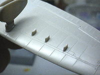 九九艦爆の主翼下面のレイアウトに間違いがありました。支柱の間隔は外側が狭くなっているのですが、キットでは逆に内側が狭くなっています。 真ん中の支柱をカットして付け替えなくてはいけません。