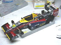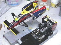 タイヤを残して組み上がった状態です。クリアがまだ固まりきっていないので、ボディを接着するときに指紋の痕が付いてしまうのですが、ティッシュで磨きながらなんとかごまかしました。
