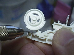 前輪の支柱が左右でくっついて板になっているというナメた造りなので、まずはその部分を削り込んでいきます。