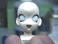 顔を描いていきます。まず、睫毛をマホガニーで塗り、そのあとに白目を塗っていきます。白目はホワイトに微量のインディブルーを混ぜた色で、睫毛を細く塗り残すように重ね塗りします。
