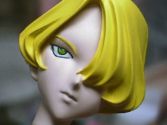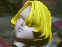 顔をマスキングして髪の毛を塗っていきます。はじめはホワイトにイエローを混ぜた色を下地として吹きます。