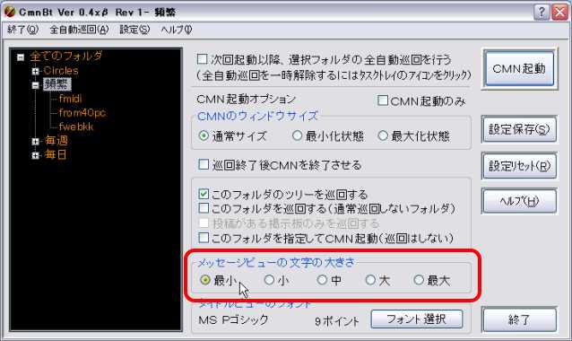 CMNのメッセージビューのフォントサイズはIEで設定したものになります。IEで通常使うフォントサイズだとCMNでは読みづらい、逆にCMNで読みやすいフォントサイズにするとIEでは読みづらいといった時に使用すると便利です。なお暫定的な実装であり動作保証が完全に取れてはいません。